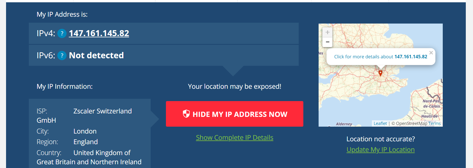 Insight Services is based in Cardiff so if we lookup our IP using the free service whatismyipaddress.com then it shows that we are in London. This is actually our VPN provider who use a large pool of IPs that can change as the scale for demand increases.
